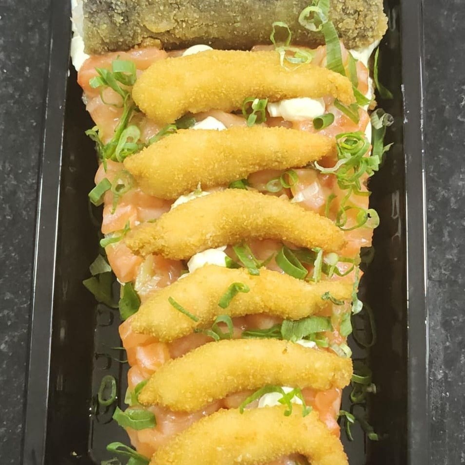 Manga, sunomonu, salmão, shimeji, cebola roxa, creme chesse, batata crispy, shari, tomate cereja, gergilim, couve crispy