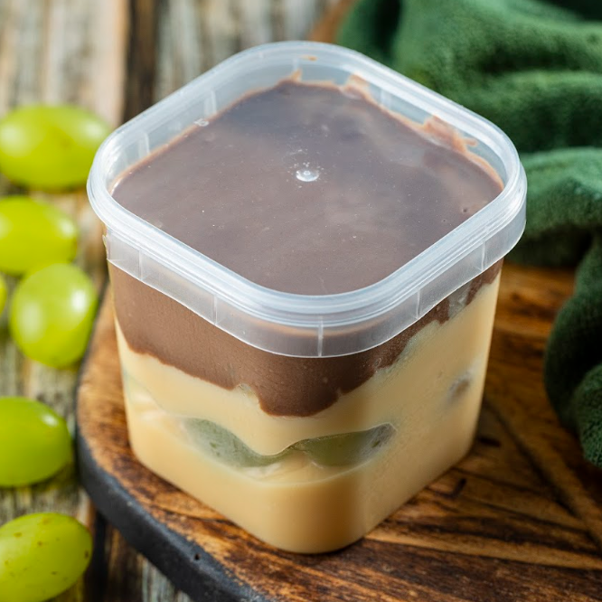 Nosso queridinho da loja! O Bolo de Pote Surpresa de Uva combina brigadeiro branco cremoso, camadas generosas de uvas verdes sem sementes e finalização com ganache, criando uma explosão de sabor e textura a cada colherada. Perfeito para quem ama sobremesas cremosas, geladas, individuais e artesanais, ideal para delivery, lanche rápido ou para presentear. Cada pote é cuidadosamente preparado para manter frescor e sabor impecáveis. (Individual)