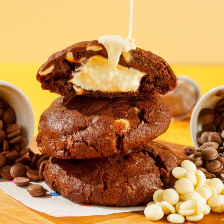 Um cookie Triplo Choco White é caracterizado por uma massa saborosa, tipicamente de chocolate ou cacau, enriquecida com três tipos de chocolate, incluindo chocolate branco e outros tipos como ao leite e/ou meio amargo.