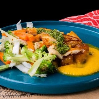 Peixe grelhado ao chimichurri, fritas, legumes e molho de pimenta amarela.