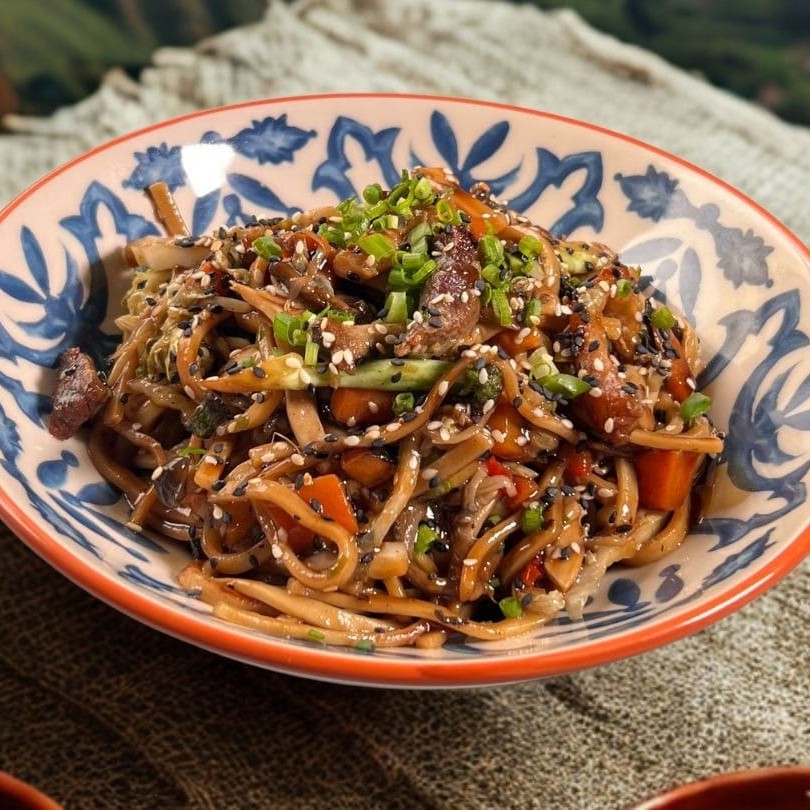 Porco, frango e carne, udon , legumes em molho da casa oriental