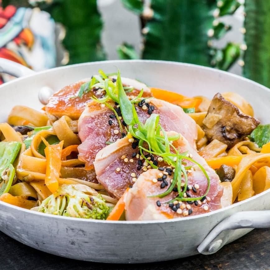 Udon salteado com legumes no molho shoyu. Atum (150 gr).