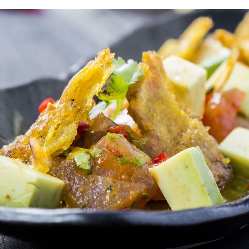 Peixe marinado com leite de tigre, pimenta amarela acompanhado de patacones (crocante de banana), abacate e fio de azeite.