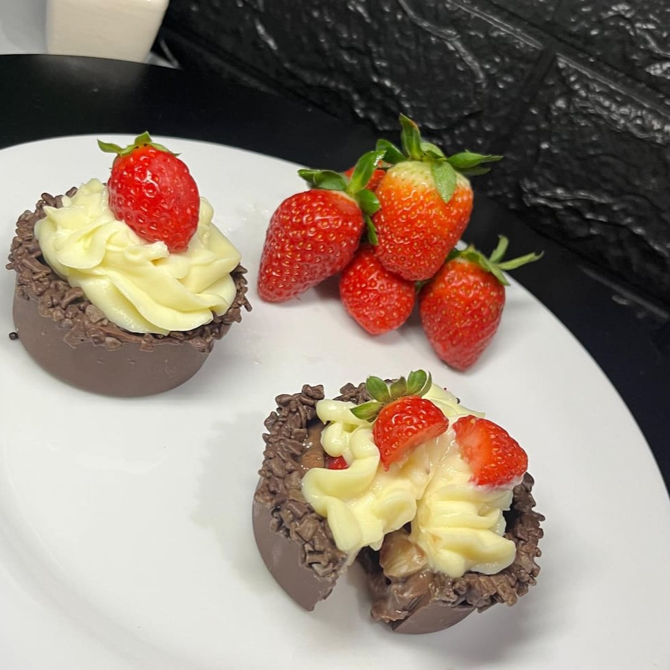 Deixe-se contagiar pela nossa irresistível doçura! Apresentamos o nosso Bombom de Morango, uma verdadeira obra-prima gourmet. Esta delícia é meticulosamente preparada com um suculento recheio de brigadeiro, realçado pela acidez refrescante de morangos picados. Para emoldurar este magnífico doce, uma cobertura decadente de Creme de Leite Ninho, que acrescenta uma textura cremosa e um sabor sutilmen