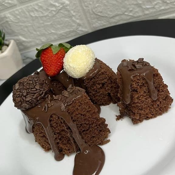 Bolo é carinho em forma de comida <3 Um delicioso Bolinho Vulcão de Chocolate com Brigadeiro de Chocolate, 1 Bombom de Brigadeiro chocolate, 1 Bombom de Brigadeiro Leite Ninho, 1 Morango e para finalizar flocos de chocolate.