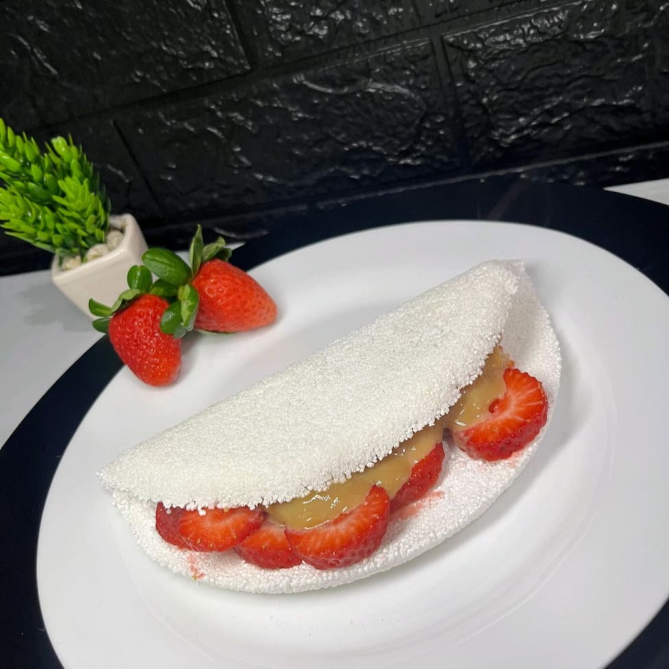 Uma delícia dessa você tem que provar <3 Uma deliciosa Tapioca com Morangos Picados e Doce de leite.