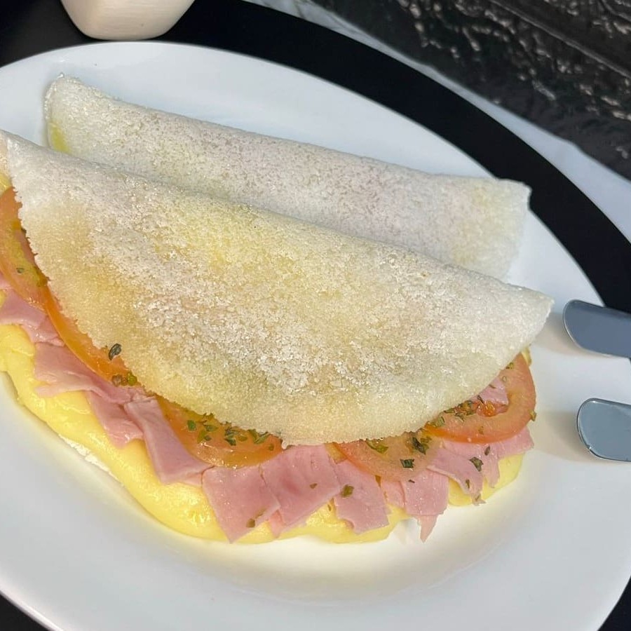 A Suprema <3 Uma deliciosa Tapioca com Muçarela, Peito de Peru, Ovo, Requeijão Cremoso Culinário, Tomate, Azeitona e Orégano para finalizar.