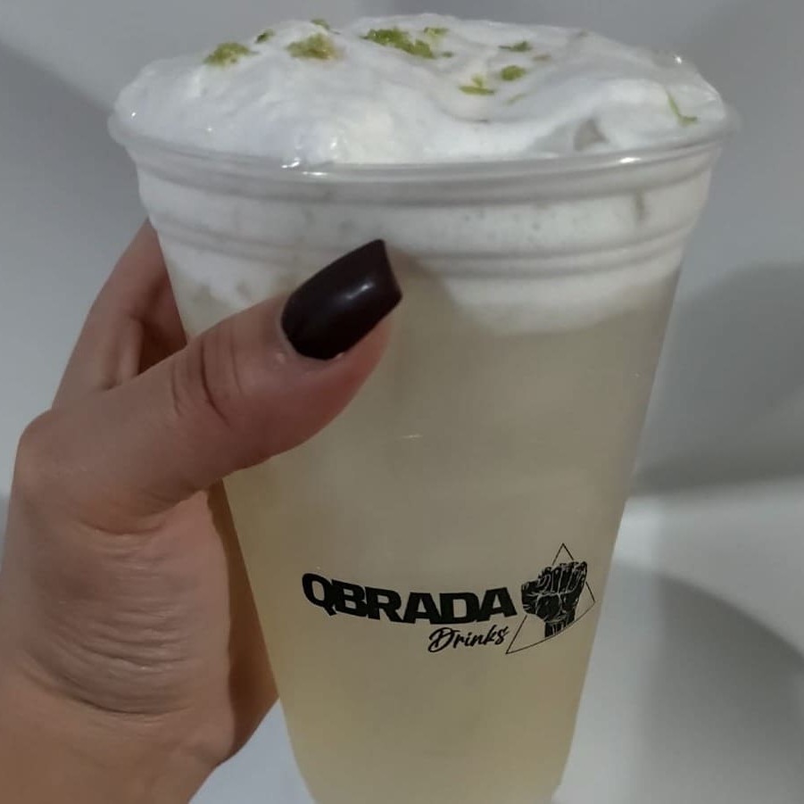 Uva verde, destilado de sua preferência, açúcar e gelo . Copo de 500ml e canudo.