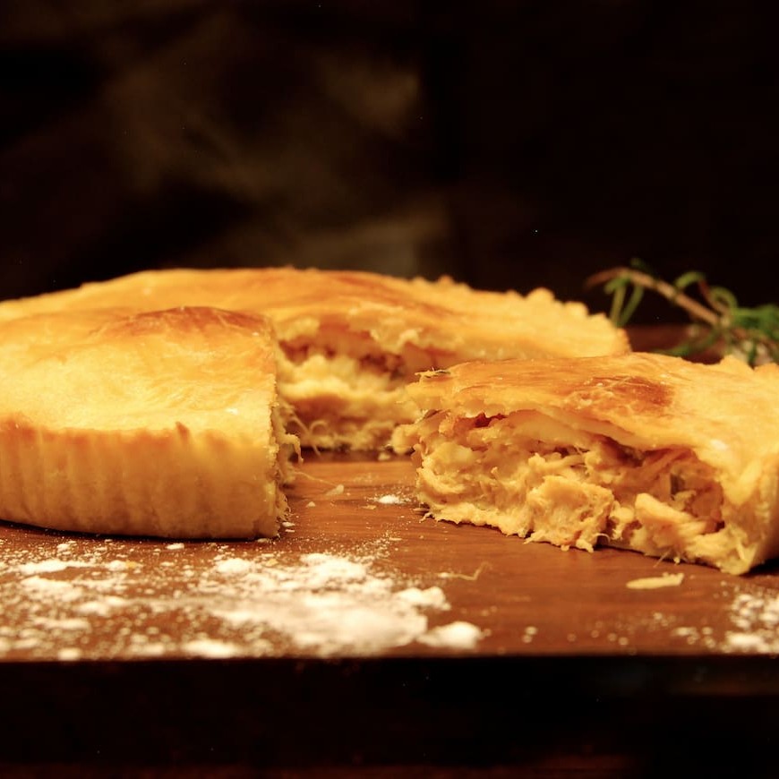 Deliciosa torta artesanal de Frango com Catupiry. Essa é a torta mais pedida no Quintal 59. Massa leve e crocante, recheio saboroso, bem temperado e servida quentinha. Serve até 02 pessoas.