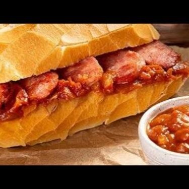 Lanche de espetinho de linguiça. Acompanha - Pão francês, vinagrete, maionese de alho e mussarela maçaricada.