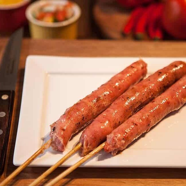 Delicioso espetinho de linguiça apimentada, grelhado na brasa.