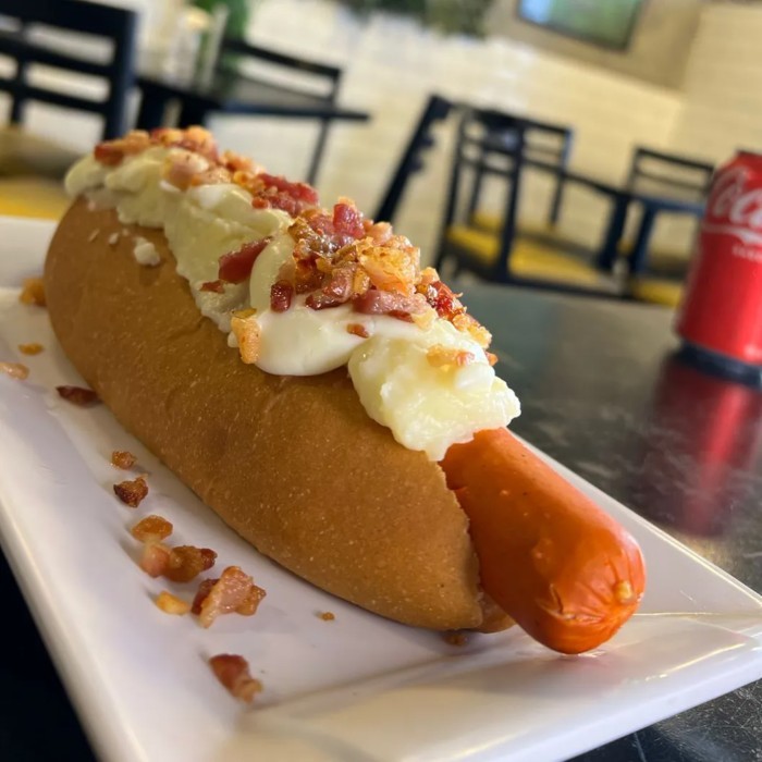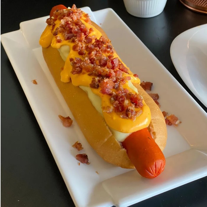 2 salsichas, purê de batata, maionese, creme de cheddar e bacon.