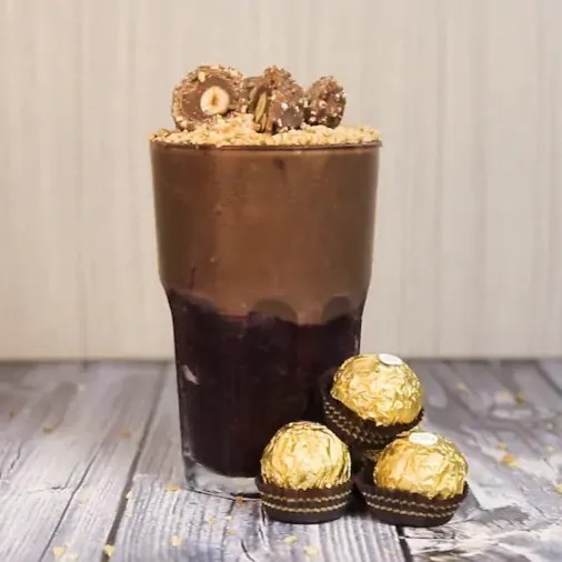 Chocolate Ferrero Rocher, ganache de chocolate preto e amendoim triturado.