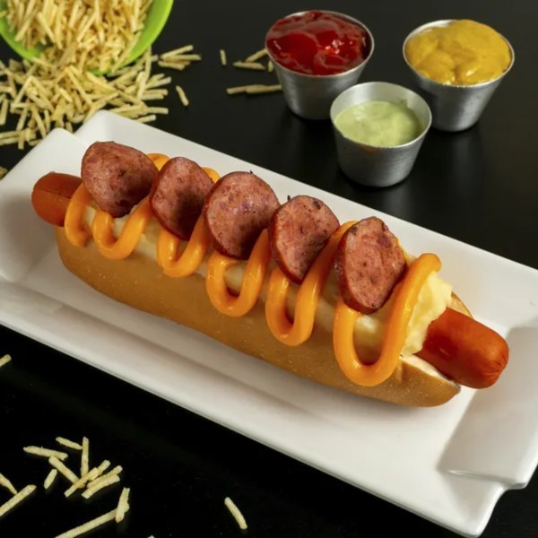 2 salsichas, calabresa, maionese, queijo cheddar e purê de batata.