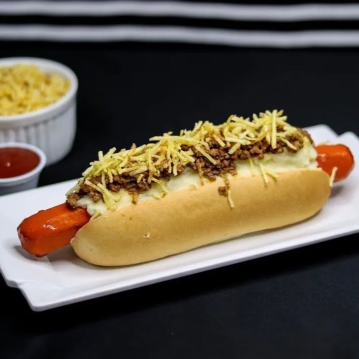 2 salsichas, carne moída, batata palha, maionese e purê de batata.