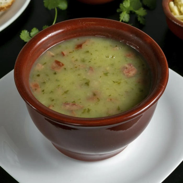 Caldo verde com calabresa, acompanha pão e queijo mussarela. 500ml