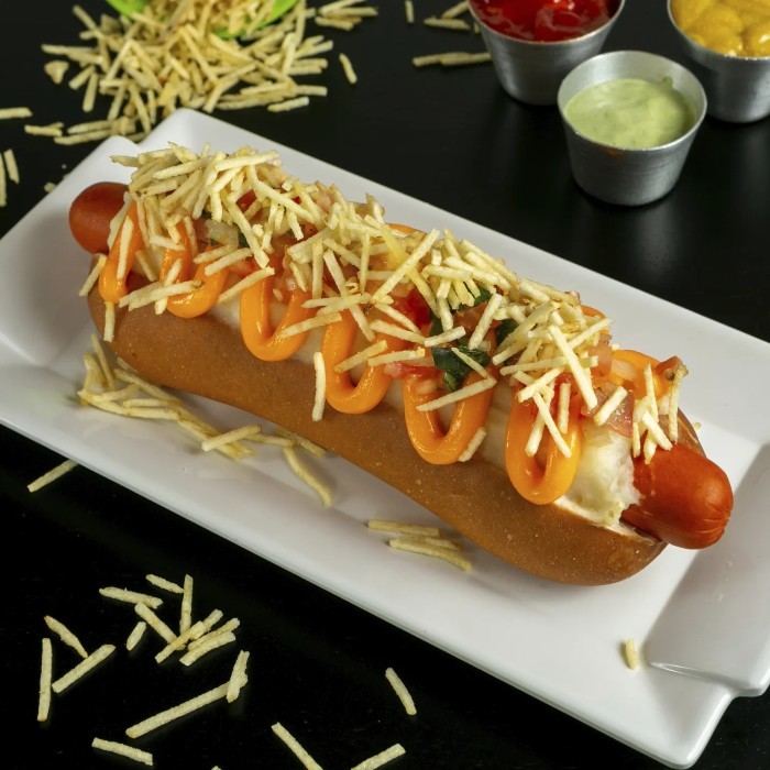 2 salsichas, batata palha, maionese, vinagrete, queijo cheddar e purê de batata.