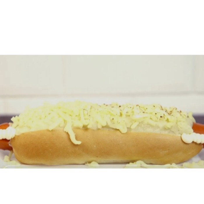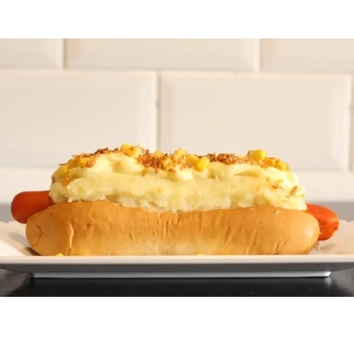 2 salsichas, queijo mussarela gratinado, maionese e purê de batata.