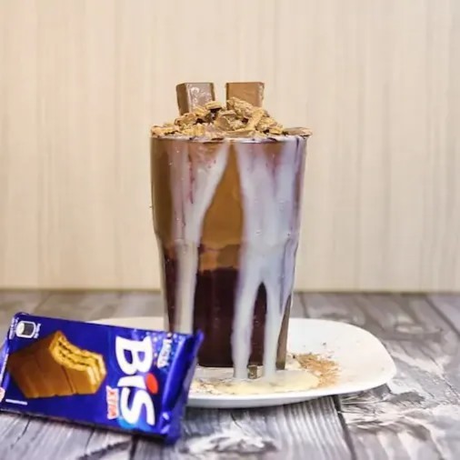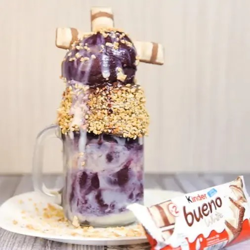 Chocolate Kinder Bueno, leite condensado, amendoim triturado e Nutella.