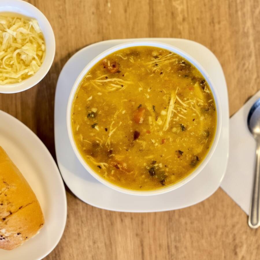 Caldo de mandioca com frango desfiado, bacon e calabresa, acompanha pão e queijo mussarela. 500ml