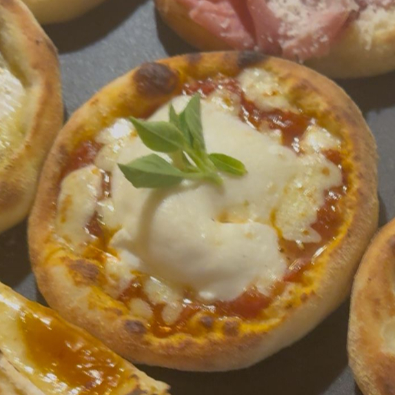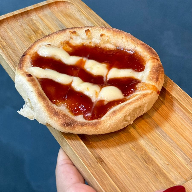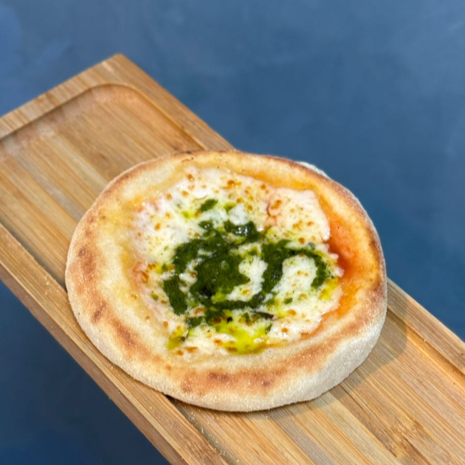 Esfirra inspirada na pizza marguerita, com queijo mussarela, molho de tomate e molho pesto de manjericão. Massa de longa fermentação, porção de aproximadamente 80 g.