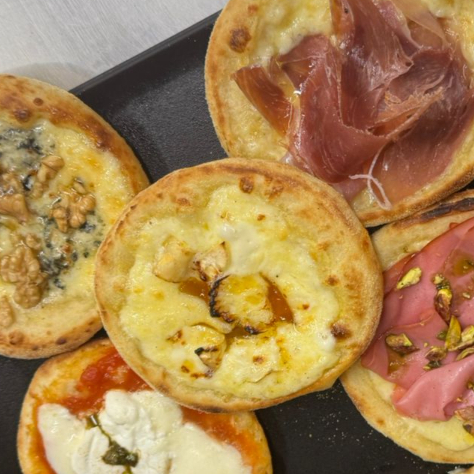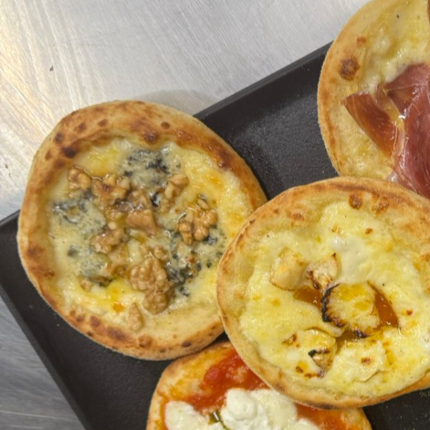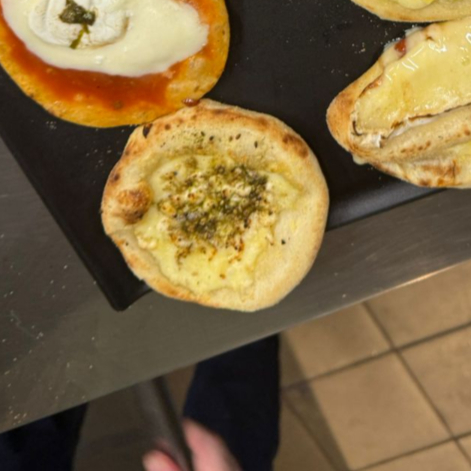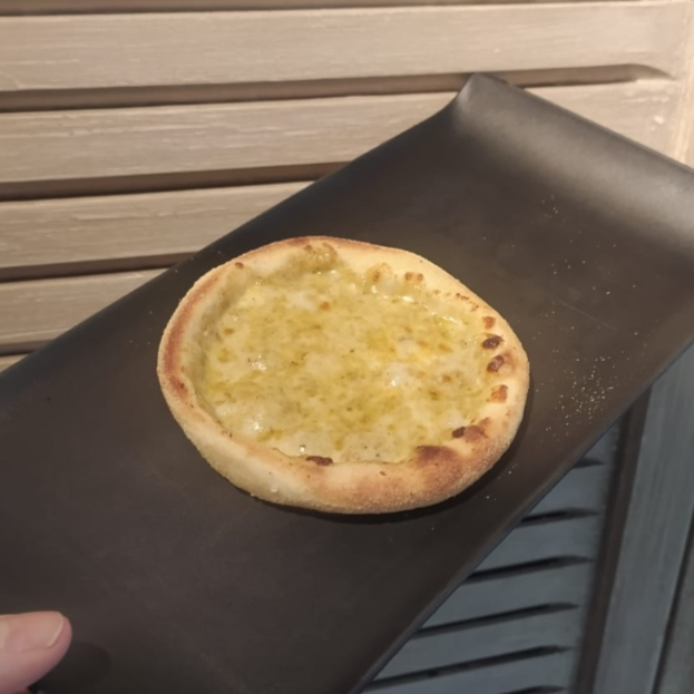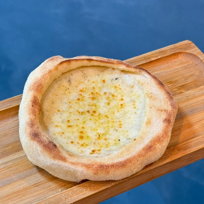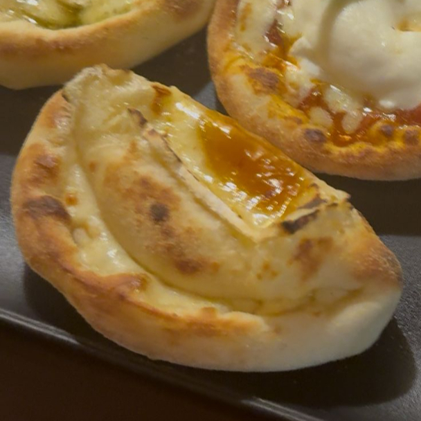 Esfirra de queijo mussarela, requeijão, parmesão e gorgonzola. Massa de longa fermentação, porção de aproximadamente 80 g.