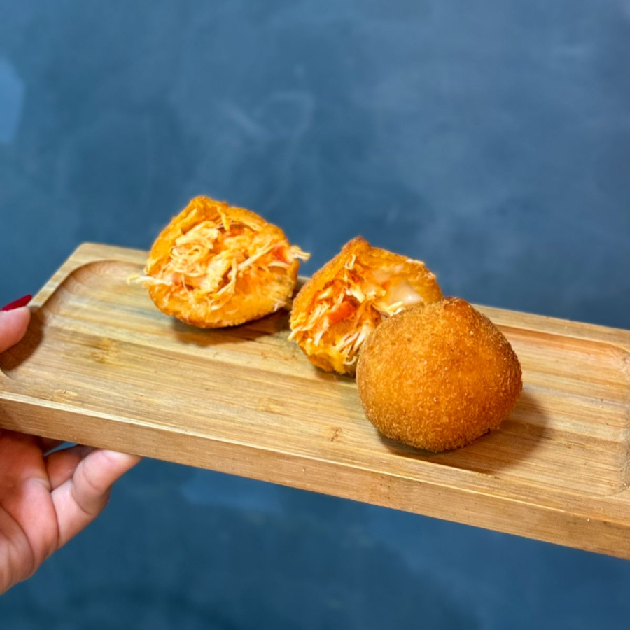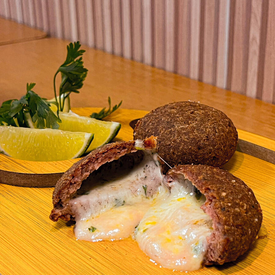 Variação do tradicional quibe frito, com uma porção generosa de coalhada dentro para manter a suculência e realçar os sabores. Porção de aproximadamente 70 g.