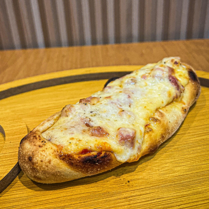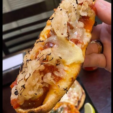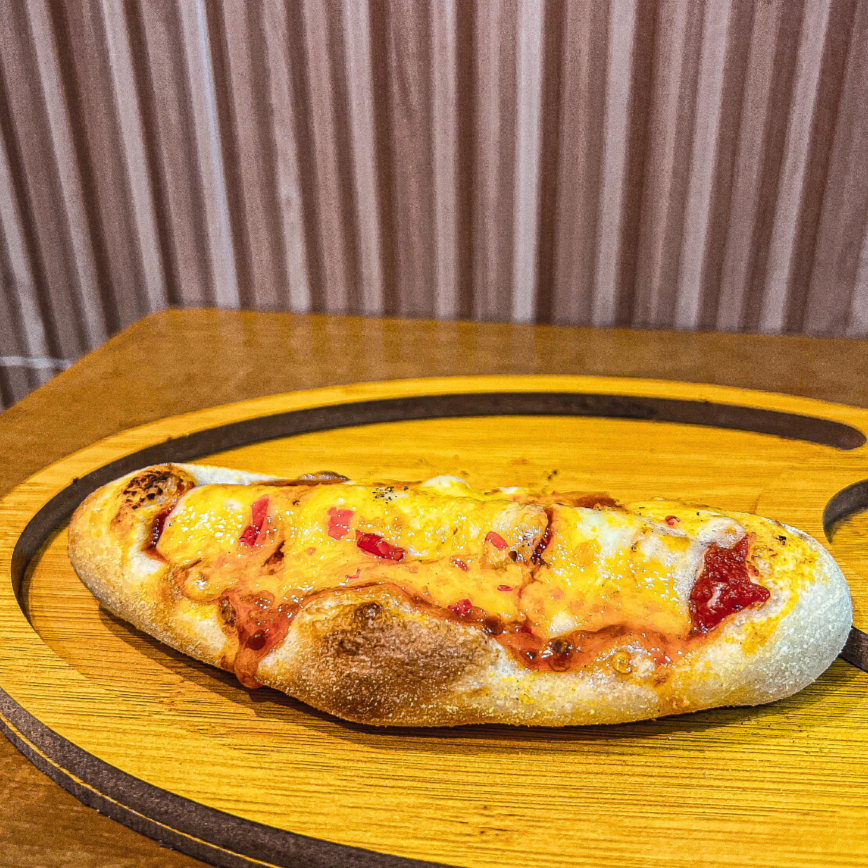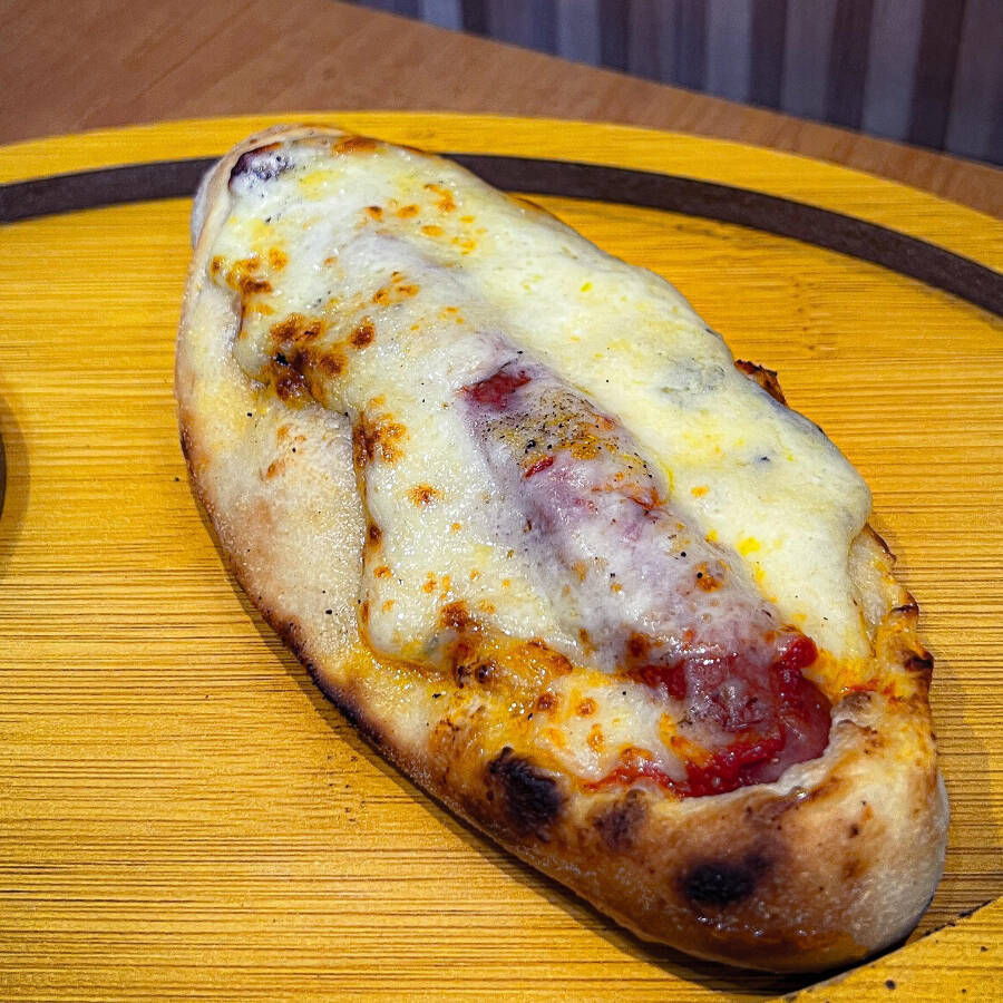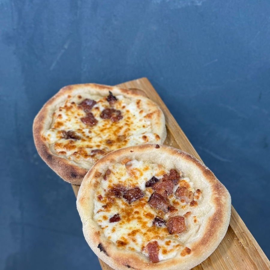 Nossa massa de fermentação natural envolve uma linguiça defumada, molho de tomate e coberto com nossa mistura de queijo muçarela, requeijão cremoso, parmesão e grognzola.