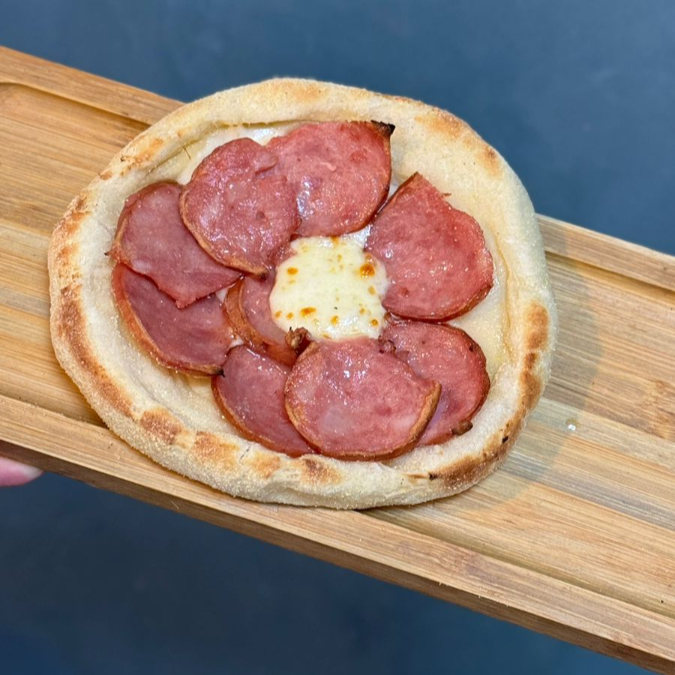 Nossa massa de fermentação natural envolve uma linguiça defumada, molho de tomate e queijo muçarela.