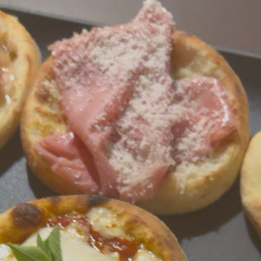 Esfiha de queijo com cobertura de presunto cru e generosas lascas de queijo Grana Padano. Massa de fermentação natural. Aproximadamente 80g por porção.