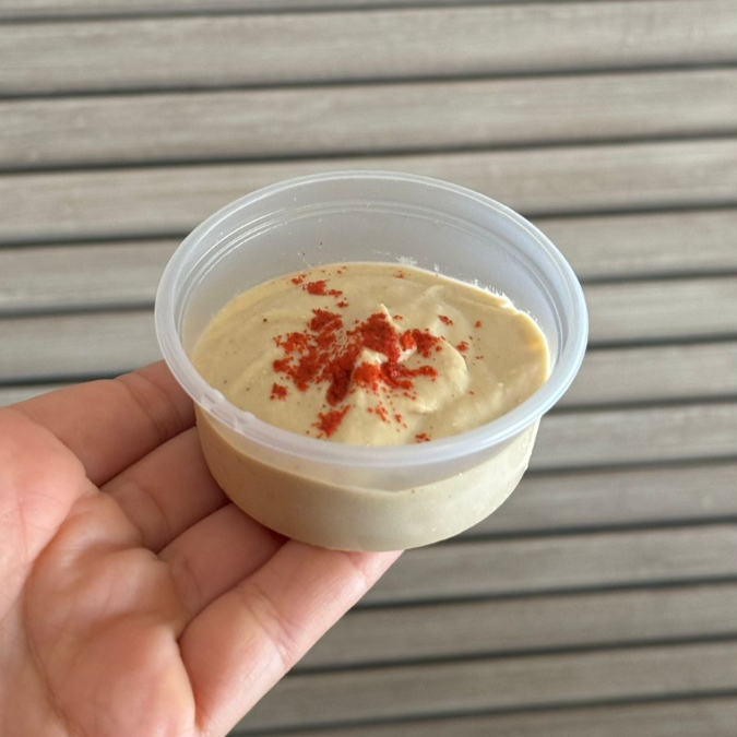 Um clássico da comida do Oriente Médio, homus de grão de bico com tahine e uma pitada de páprica. Porção individual de aproximadamente 70 g.