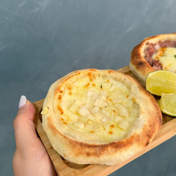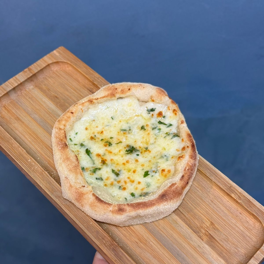 Esfirra de queijo mussarela e requeijão, com uma pitada de salsinha. Massa de longa fermentação, porção de aproximadamente 80 g.