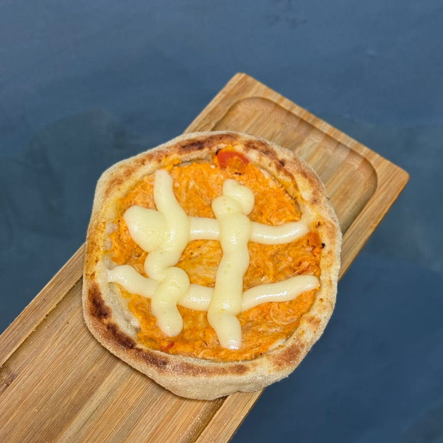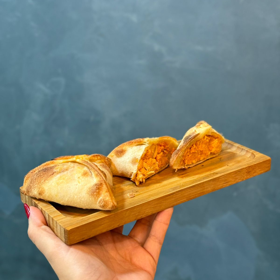 Esfirra de frango desfiado com uma generosa porção de requeijão. Massa de longa fermentação, porção de aproximadamente 80 g.