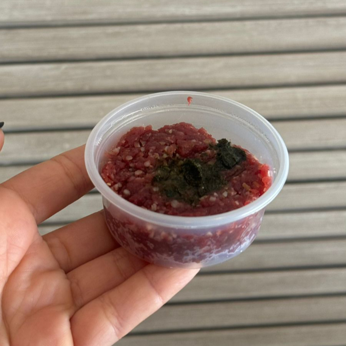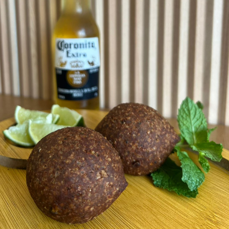 Tradicional receita árabe de carne com trigo e uma pitada de hortelã. Porção individual de aproximadamente 70 g.