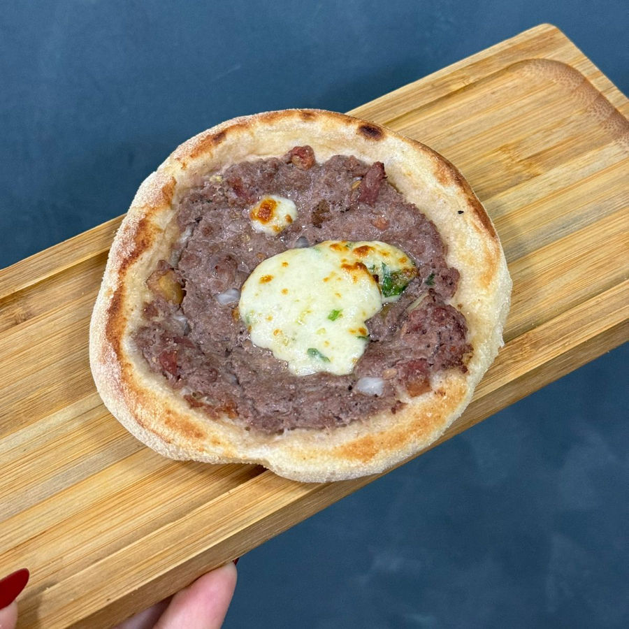 Esfirra de carne suculenta, junto com queijo mussarela e requeijão, e uma pitada de salsinha. Massa de longa fermentação, porção de aproximadamente 80 g.