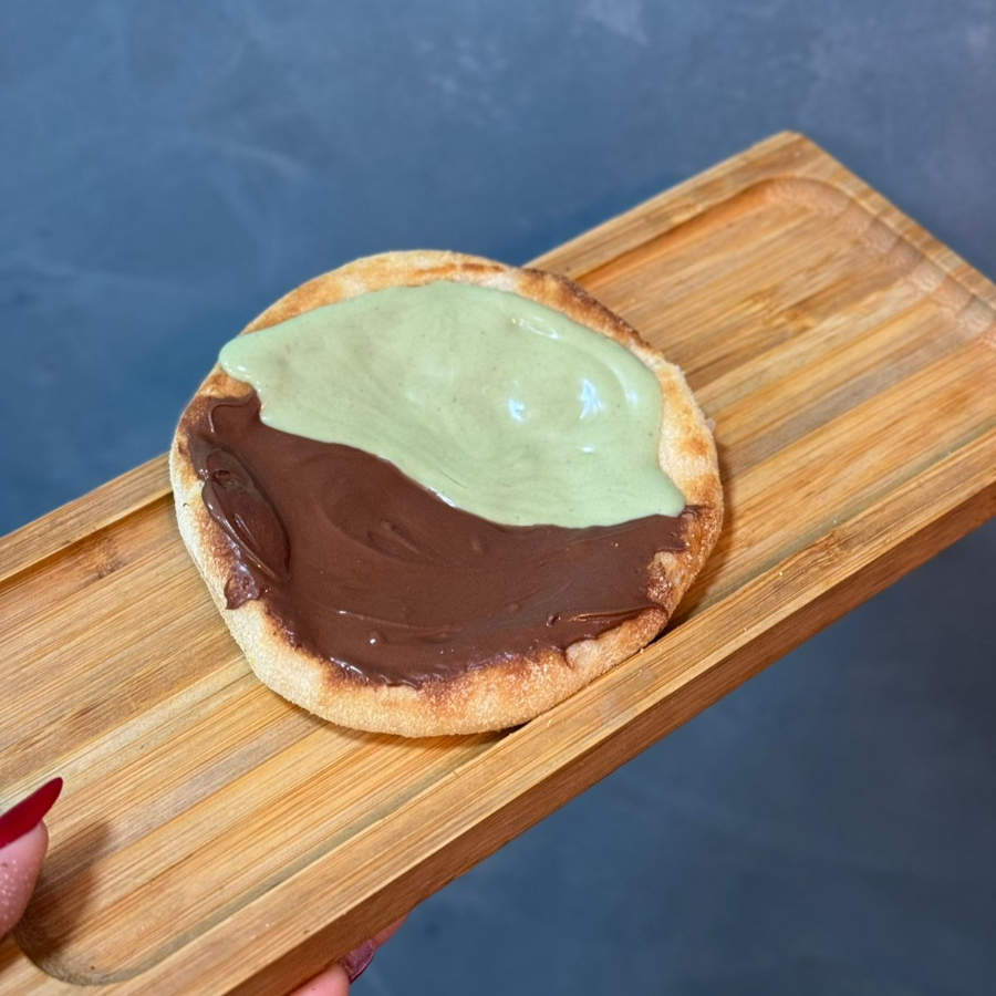 Esfirra Doce da mistura de creme de pistache com Nutella em uma base de queijo. Massa de longa fermentação, porção de aproximadamente 70 g.
