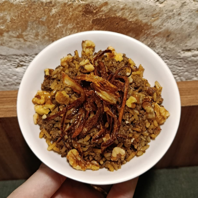 Receita típica árabe, arroz com carne temperada, cebola caramelizada e nozes. Porção aproximadamente 70g.