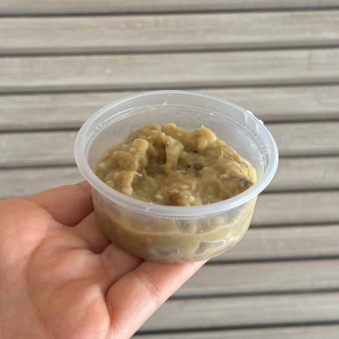 Tradicional acompanhamento árabe, pasta de berinjela com tahine e temperos. Porção individual de aproximadamente 70 g.