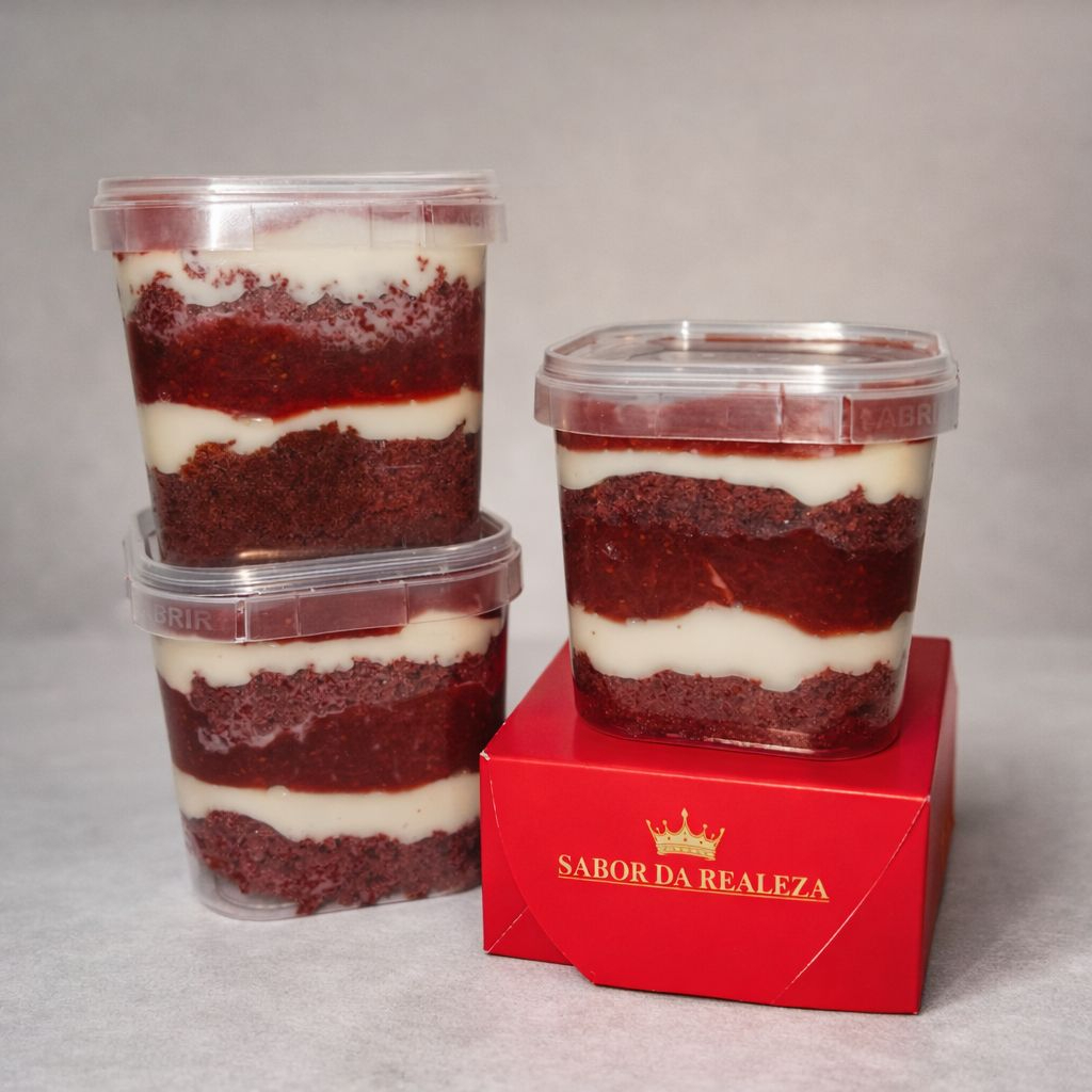 Bolo red velvet, creme de ninho e geleia de morango, pote 220ml.