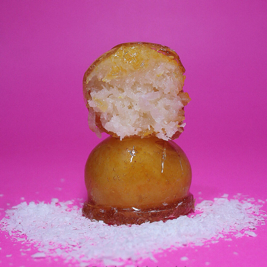 Uma sobremesa que evoca o sabor da infância! A nossa bala de coco é macia e úmida, e recebe uma fina e irresistível casquinha de caramelo. A união perfeita da suavidade do coco com a crocância do caramelo.
