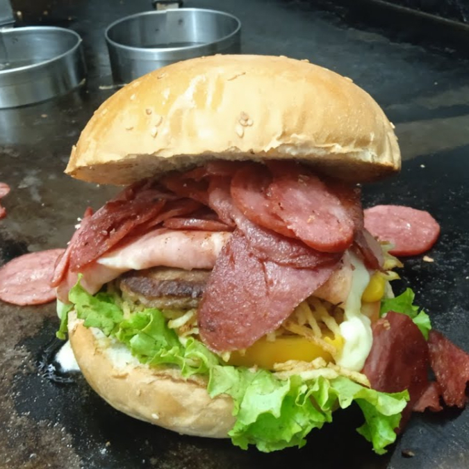 Pão, hamburguer de 90g, queijo, maionese, cheddar, alface, tomate, calabresa e presunto.