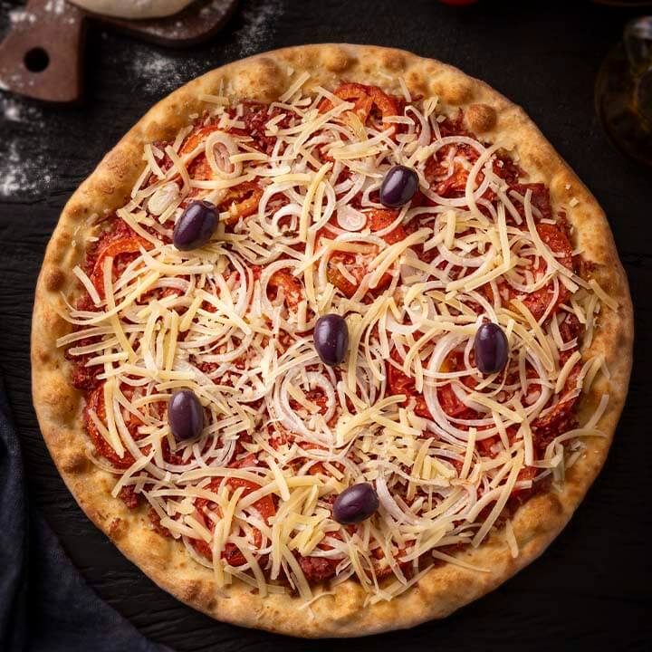 Molho de tomate caseirinho, calabresa, bacon, parmesão, mussarela, oregano e azeitona