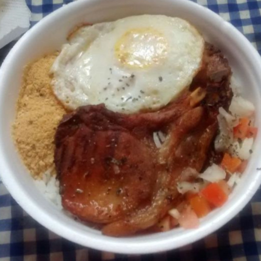 Arroz, Feijão, Bisteca a Cavalo, Guarnição do Dia e Salada.