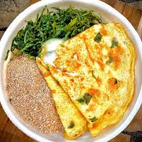 Arroz, Feijão, Omelete Misto, Guarnição do Dia e Salada.