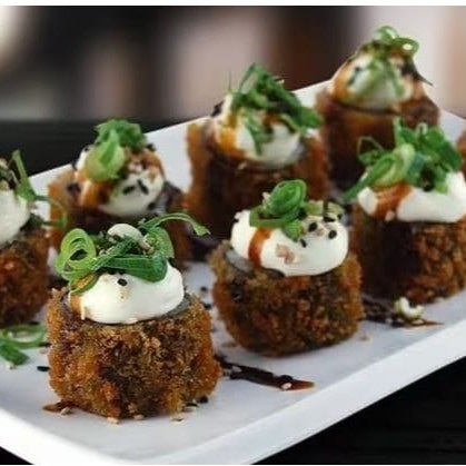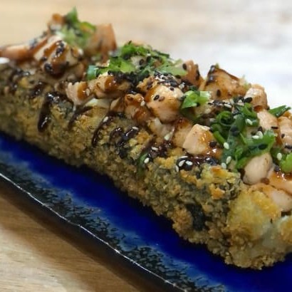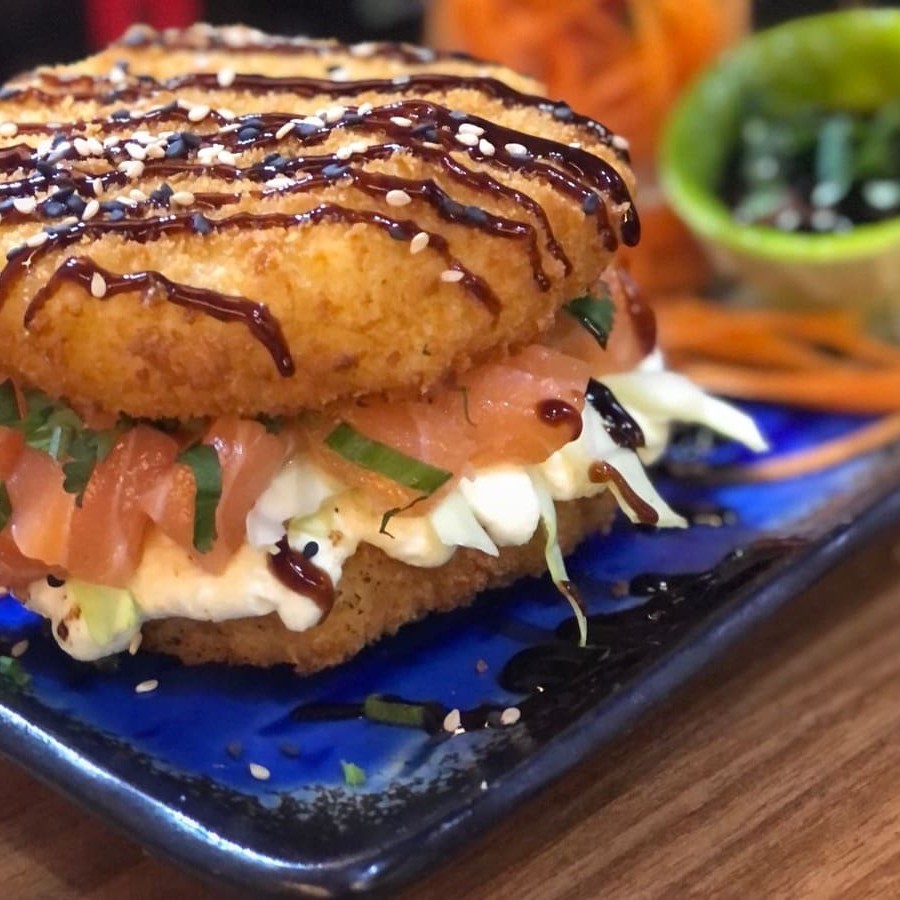 Delicioso Hamburger de Sushi Shari empanado e recheado com Salmão e Cream Cheese