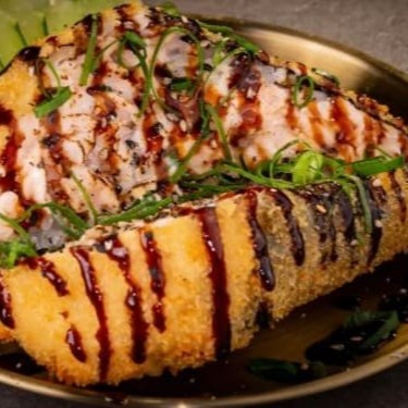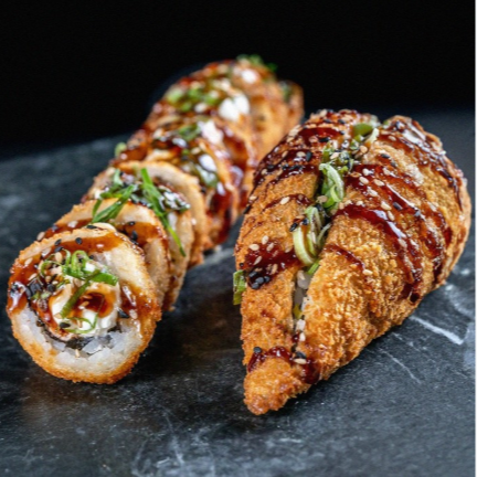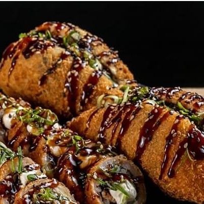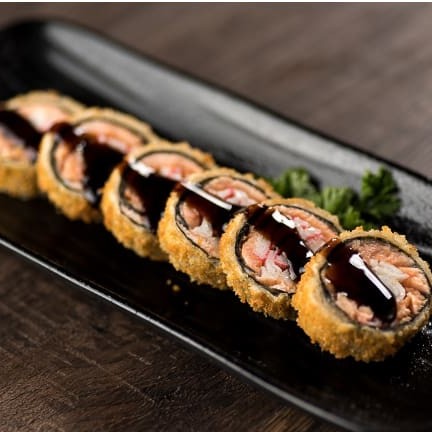 Temaki de salmão empanado, ja vem caramelizado com muito taré e cream cheese