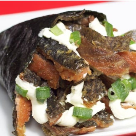 Temaki Skin, preparado com arroz, e Salmão Skin (frito) 100 G aproximadamente