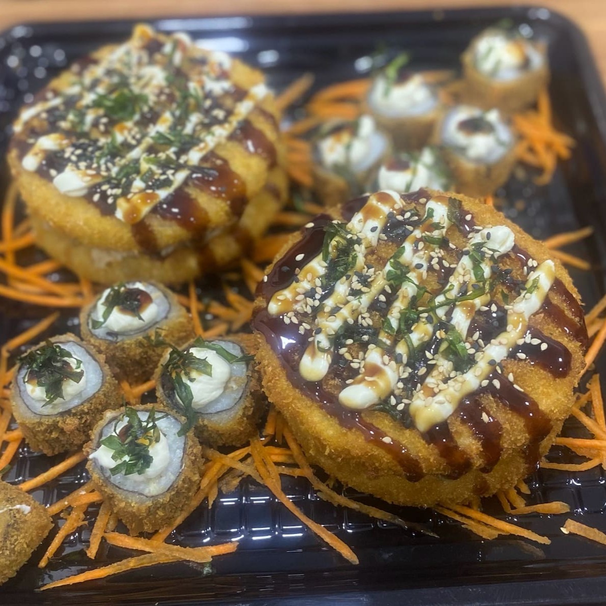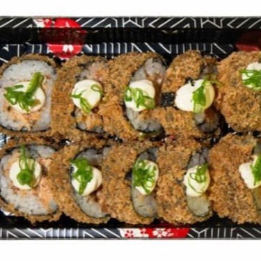 02 Temakis salmão Empanados 10 Hot rolls Hot Rolls com aprox 1,5 Cm de Diametro e 1 Cm de Altura Temaki com Aprox 07 Cm e pesa aprox 100 G Cada Item pesa aprox. 16 G e serve 02 Pessoas Não Acompanha Hashi e Molho Obs. Itens caramelizados com taré, caso não gostaria favor informar