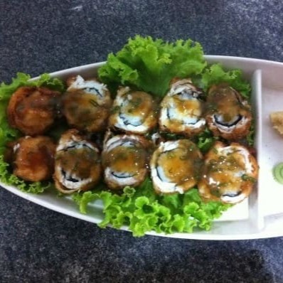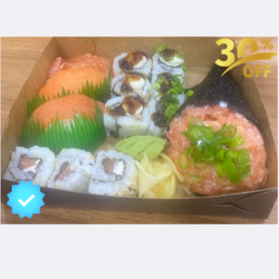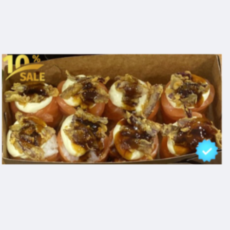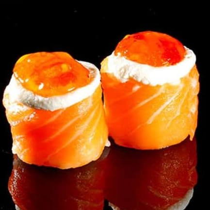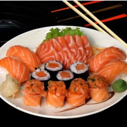 06 Sashimis de Salmão Flambado com espessura de 10 Mm 04 Sashimis de Salmão Flambado pesando aprox. 30 G 08 Uramakis especial, recheado com salmão empanado e cream cheese, coberto com 12 Gramas de salmão flambado