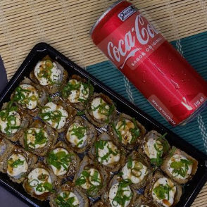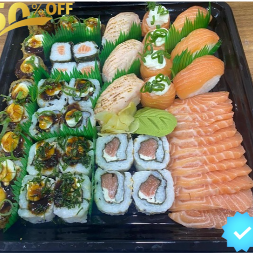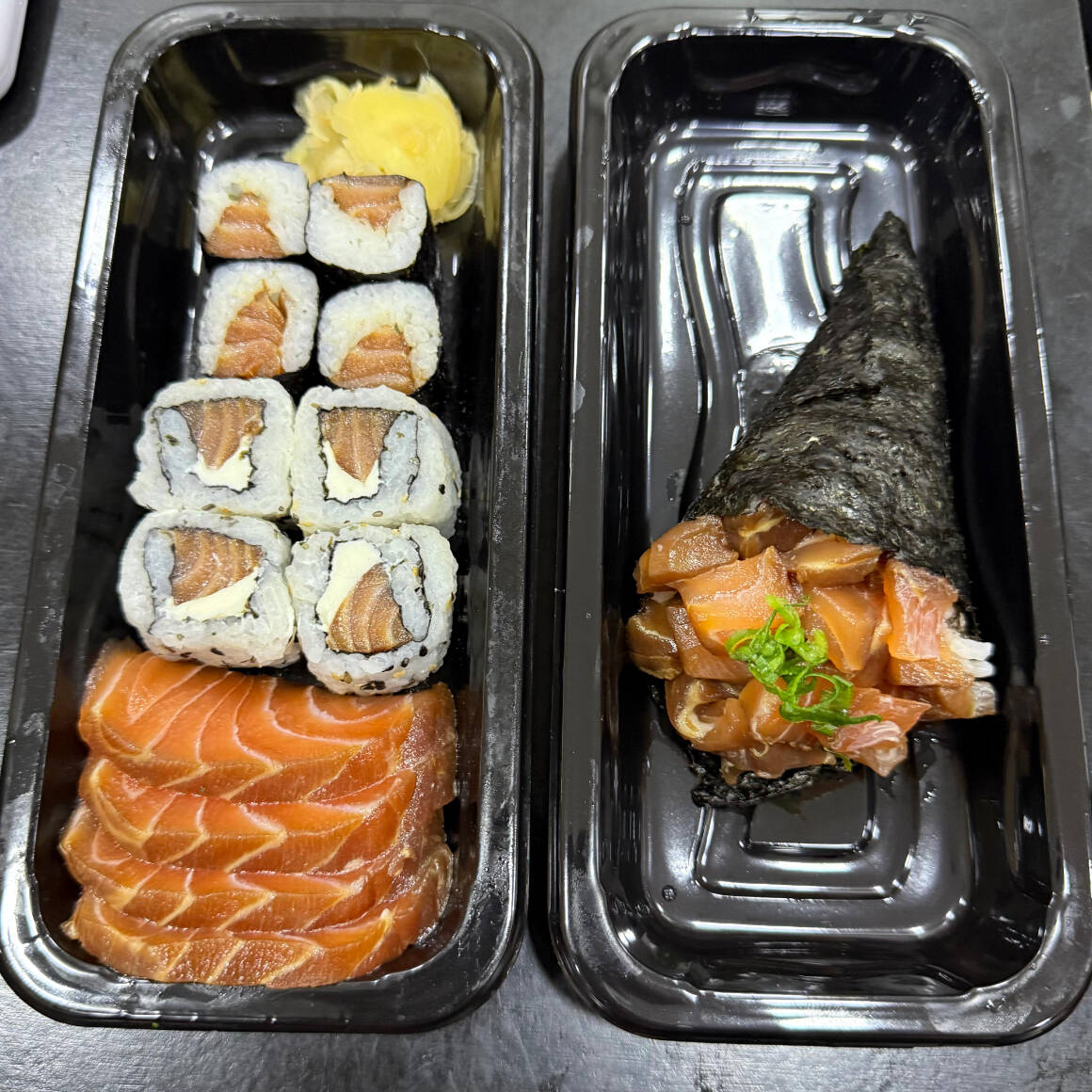 02 Temakis Gigantes 06 Hossomakis de salmão 04 Uramakis de Salmão 04 Joes